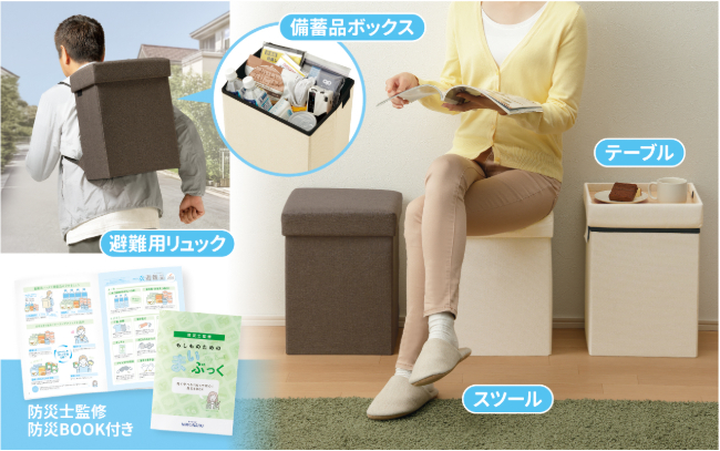 「いつも」はスツール・テーブル・オットマン・備蓄品ボックス、「もしも」の時は防災リュックとして使える多機能スツールです。