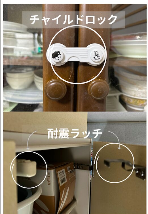 - 食器棚や備え付けの棚にはチャイルドロックや耐震ラッチを取り付け