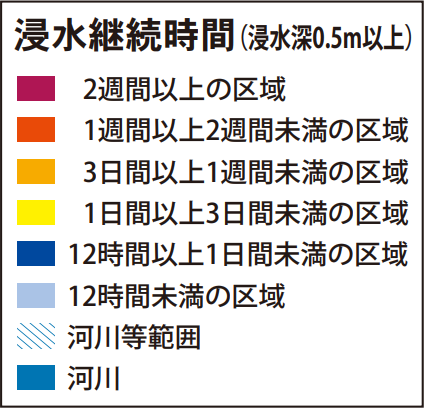 また、50cm以上の浸水が続く時間は、長いところで2週間以上とされています。田端駅に近づくにつれて、継続時間は短くなっています。