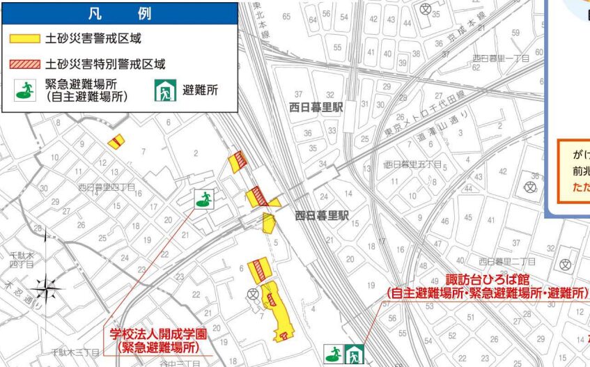 この一帯の警戒区域に近い避難所は、西日暮里3丁目の「諏訪台ひろば館」です。また、西日暮里4丁目の「学校法人開成学園」も緊急避難場所に指定されており、一時的に土砂災害を回避したい場合に利用できます。