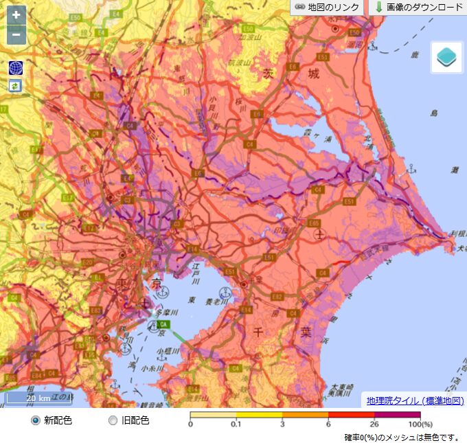 東京近郊全体の震度6強以上の揺れに見舞われる確率を見ると、6~26%のエリアが広く分布しています。3~6%の中里3丁目は、東京近郊の中でも震度6強以上の確率が低い地域と言えます。