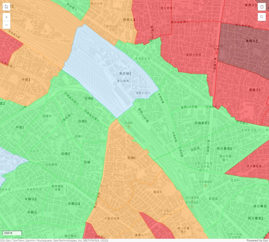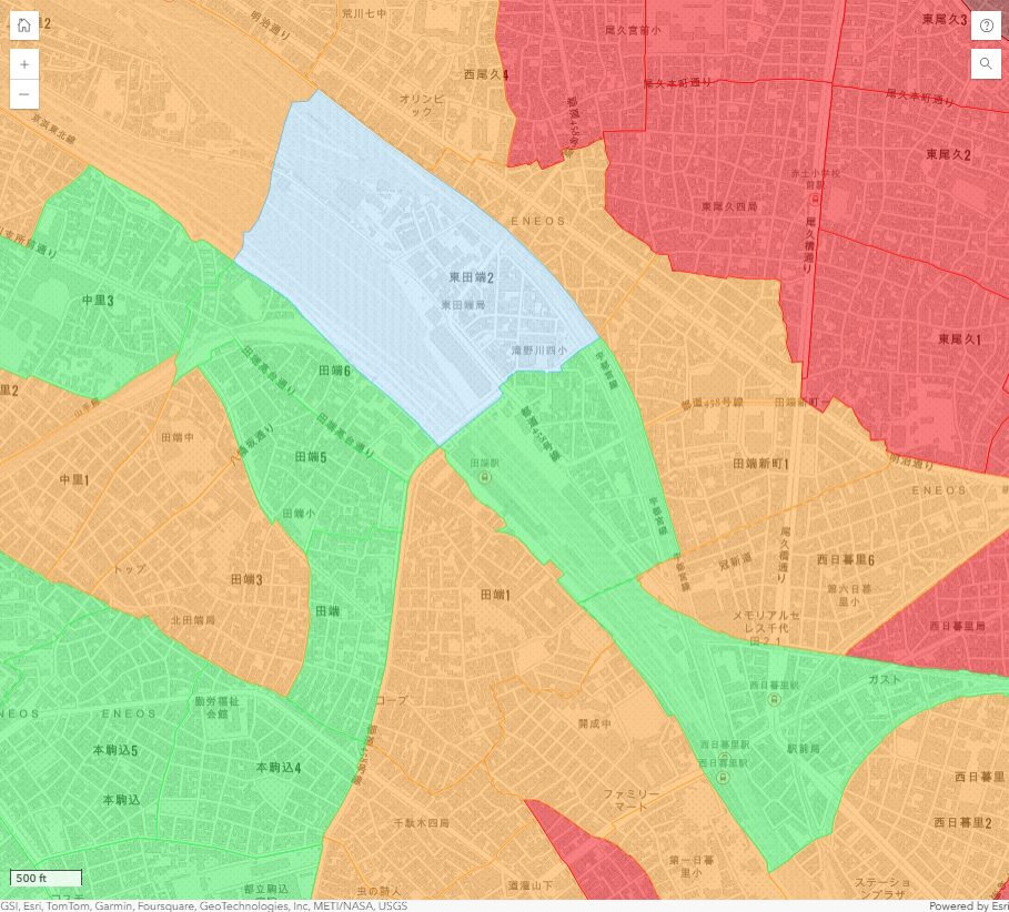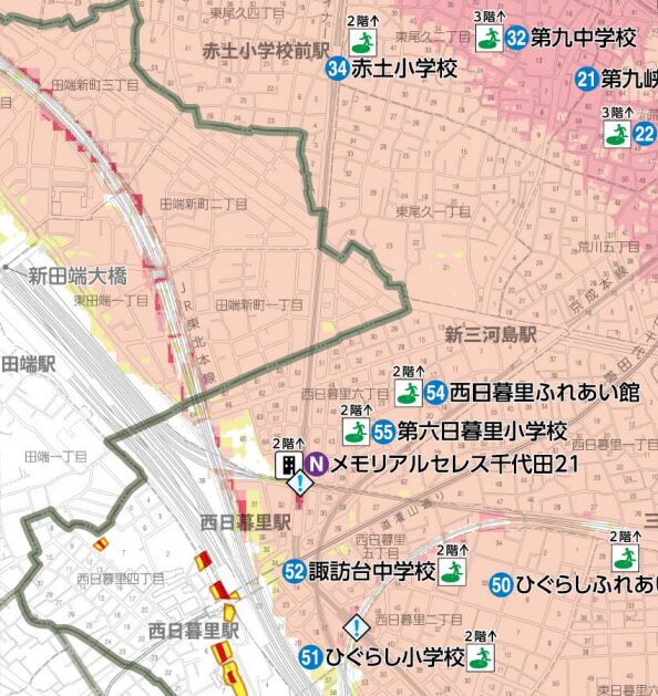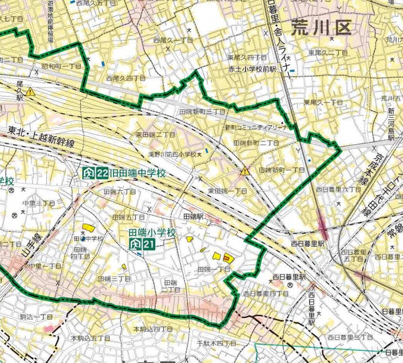 荒川区内でも、複数の土砂災害警戒区域が田端の隣駅である西日暮里駅付近にあります。レッドゾーンが含まれている警戒区域が多く見られます。