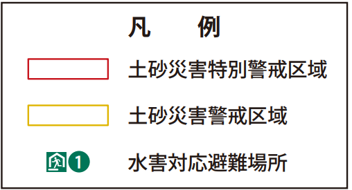 高台エリアには、複数の土砂災害警戒区域が指定されています。土砂災害特別警戒区域が含まれている場所も多いため、水害や地震発生時には特に警戒が必要です。