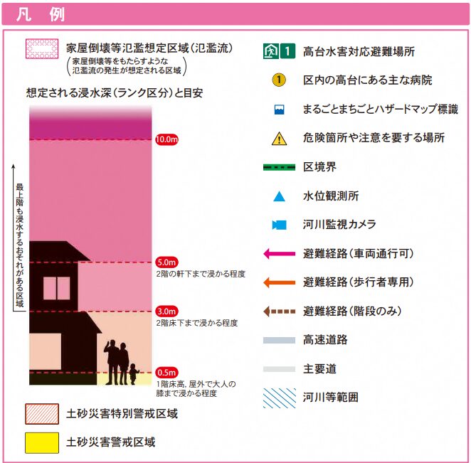 ほかには内水氾濫により、高台側でも最大3.0mの浸水が、低地では最大で5.0m程度の浸水が想定されている場所があります。