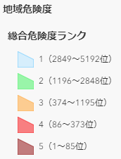田端駅周辺には、総合危険度(建物倒壊危険度と火災危険度などを合わせたもの)もランク1からランク5までの地区があります。