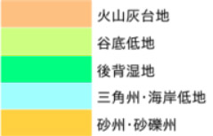 田端駅周辺の地盤は、「火山灰台地」「谷底低地」「後背湿地」「三角州・海岸低地」「砂州・砂礫州」の5種類あります。