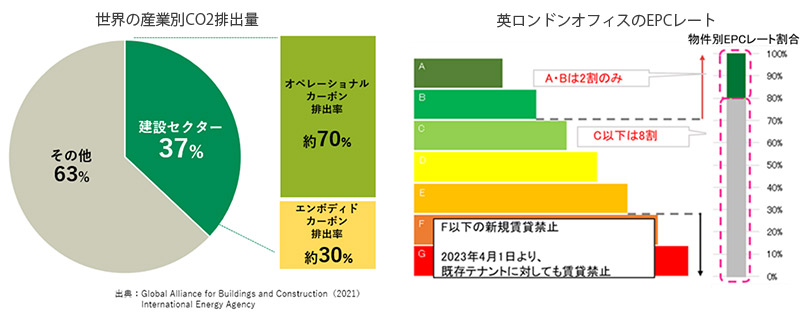 英国政府は2050年までにGHG(温室効果ガス)排出量をカーボンニュートラルにする目標を掲げており、オペレーショナルカーボンの排出削減に向け「EPCレート」がFレベル以下の建物の賃貸(新規契約・更新を含む)をすでに禁止。