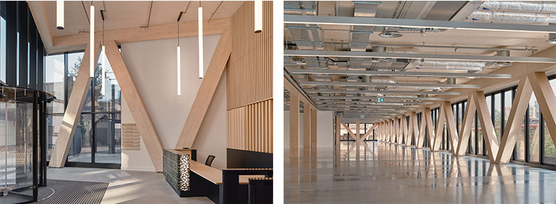 建物内部の梁、柱、天井など構造材を現す仕上げとしバイオフィリックデザインを取り入れ、木の雰囲気やぬくもりを体感できるそうです。