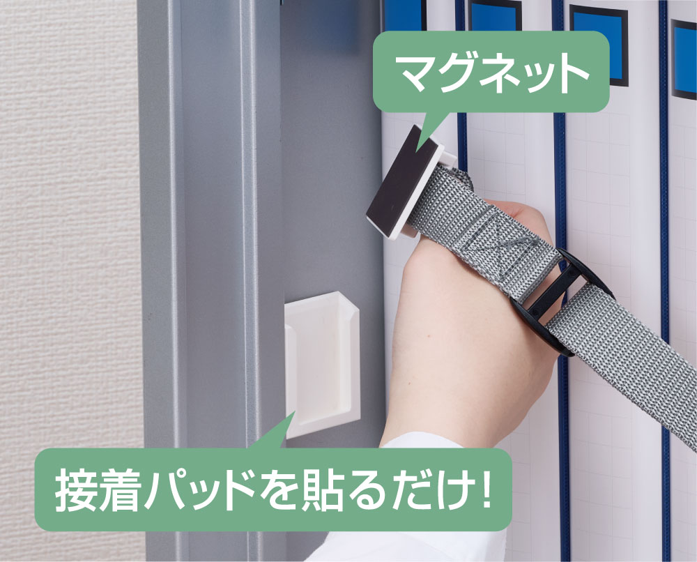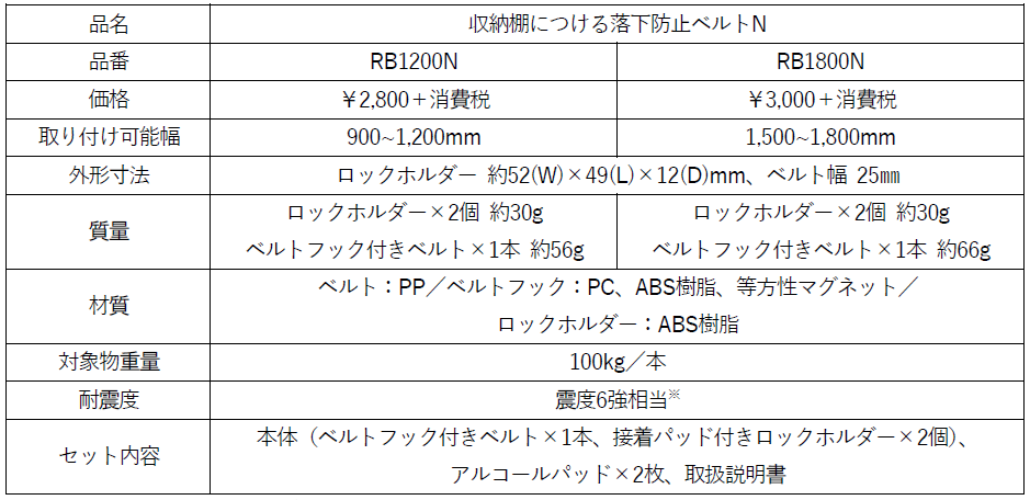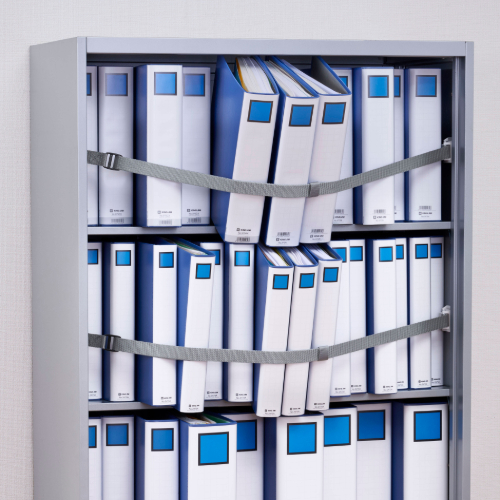 スチール棚に取り付けるだけで、棚に収納したファイル類、段ボール、保存箱、雑誌、などの落下を防止できるベルトです。震度6強※の揺れに対応しており、災害時の避難経路確保にも役立つということです。