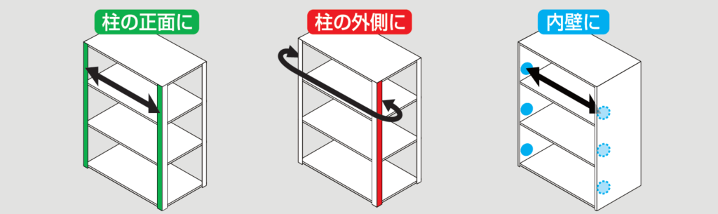 正面、外側、内側の3通りの取り付けが可能なため、さまざまな形状の棚に簡単に取り付けできるそうです。