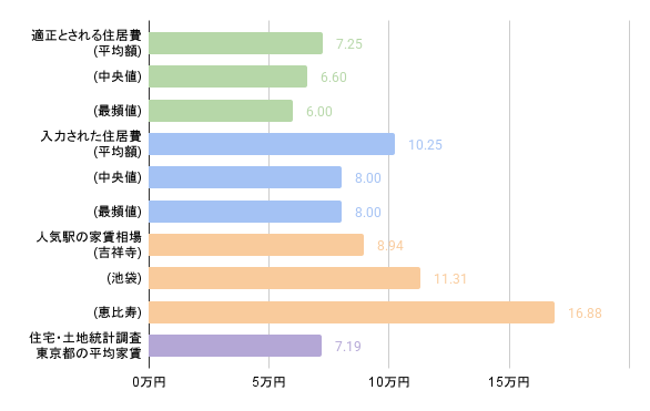 一方、入力された住居費は、平均額・中央値・最頻値ともに東京都の平均家賃を上回りました。人気駅の家賃相場との乖離も少なく、より現実的な数字となっていることがうかがえます。