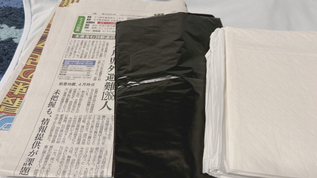 簡易トイレに加えて、トイレの災害対策として、ペットシーツ(ワイドサイズ)・ゴミ袋・新聞紙を備えています。