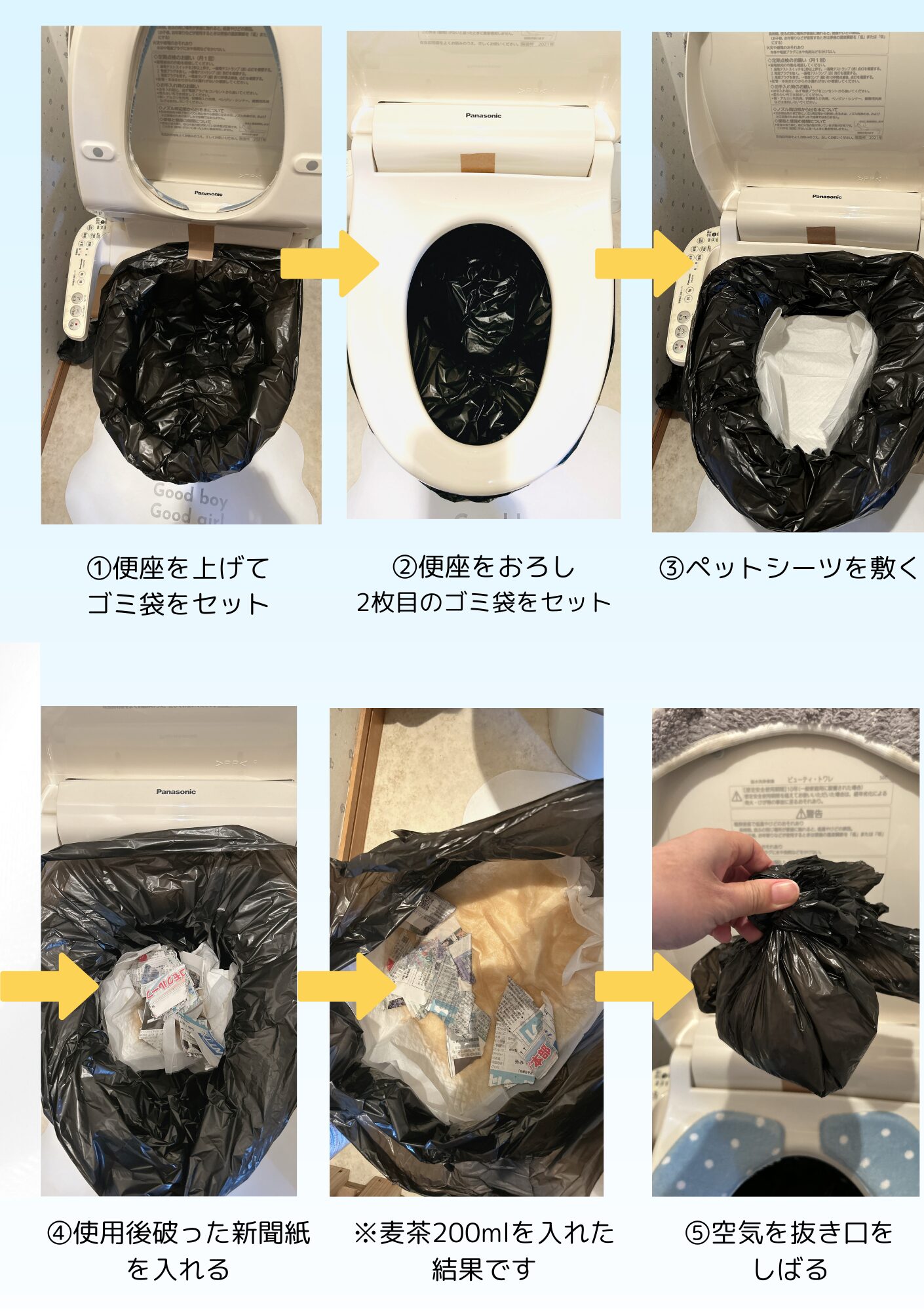 必要なものは・ゴミ袋1枚・ペットシーツ1枚・新聞紙です。使い方としては①便座をあげゴミ袋をセット②便座をおろして替え用のゴミ袋を設置③ペットシーツを敷く④排泄⑤新聞紙をかぶせる⑥替え用のゴミ袋を縛って捨てるだけ。大の時はペットシーツを追加してください。