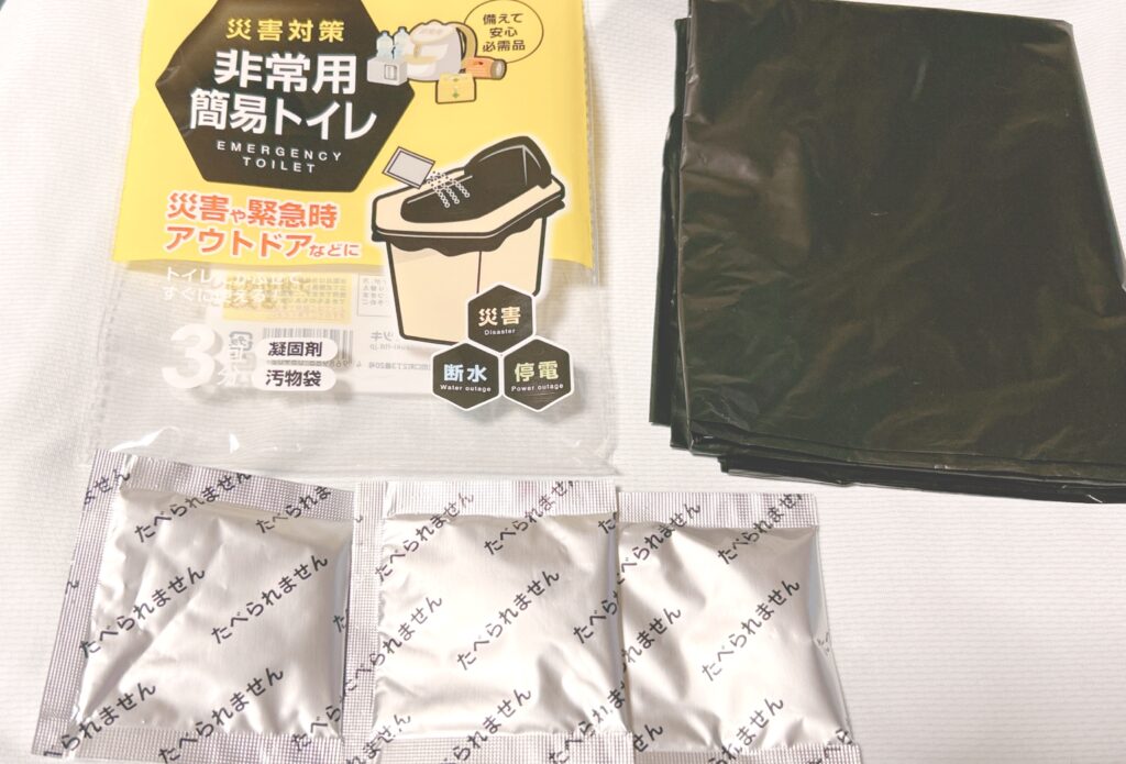 100円ショップの非常用簡易トイレを備えているのですが、3回分で110円です。一般的な成人は1日平均6回から7回トイレに行くとされていますから、1週間では49回分が必要になります。