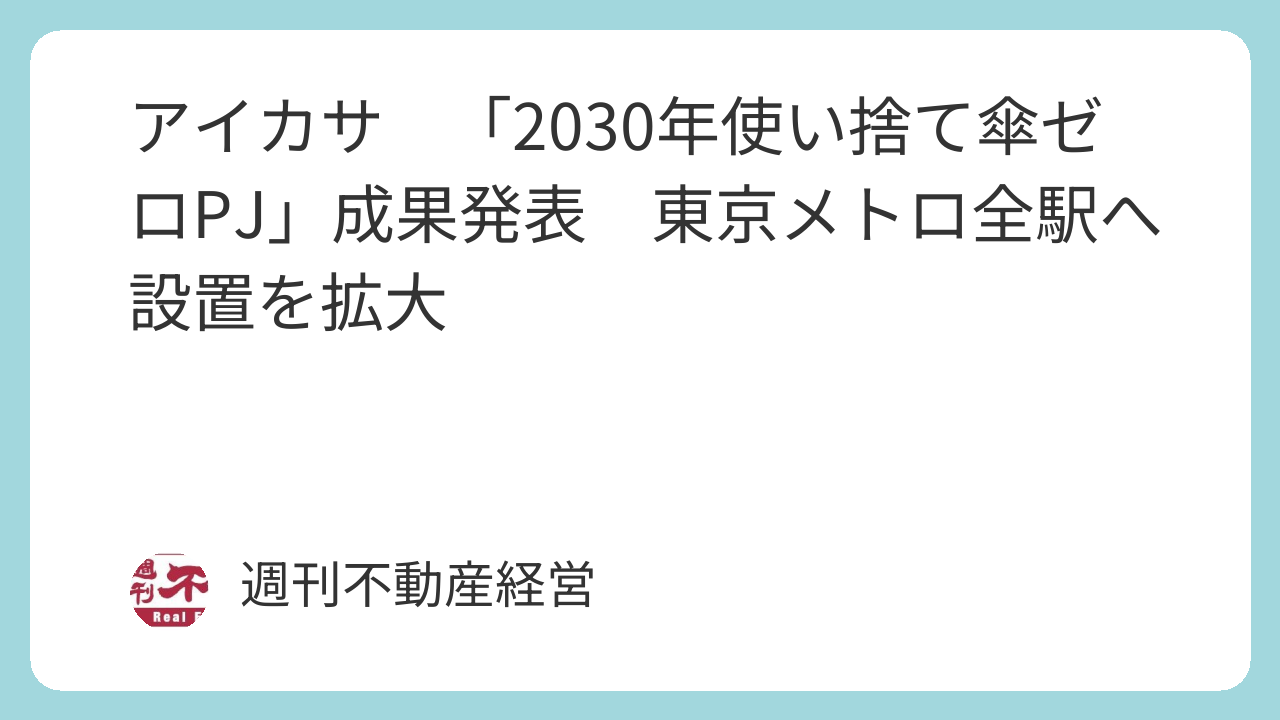 傘のシェアリングサービス「アイカサ」を展開するNature Innovation Group(東京都新宿区)は今月11日、「2030年使い捨て傘ゼロプロジェクト」の成果を報告。加えて、東京地下鉄(東京都台東区、以下東京メトロ)「渋谷」駅への設置を皮切りに東京メトロ全駅へ「アイカサ」の提供を拡大する旨を発表した。