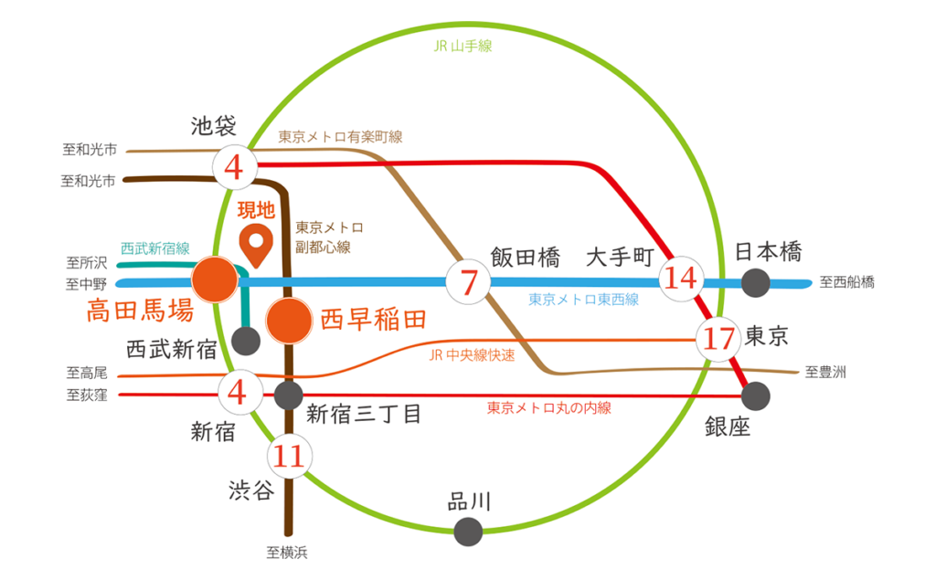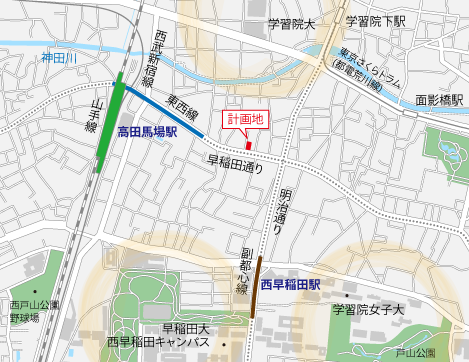 現地はJR山手線・東京メトロ東西線・西武新宿線が利用できる「高田馬場」駅に加え、東京メトロ副都心線の「西早稲田」駅も使える交通利便性の高いポジション。