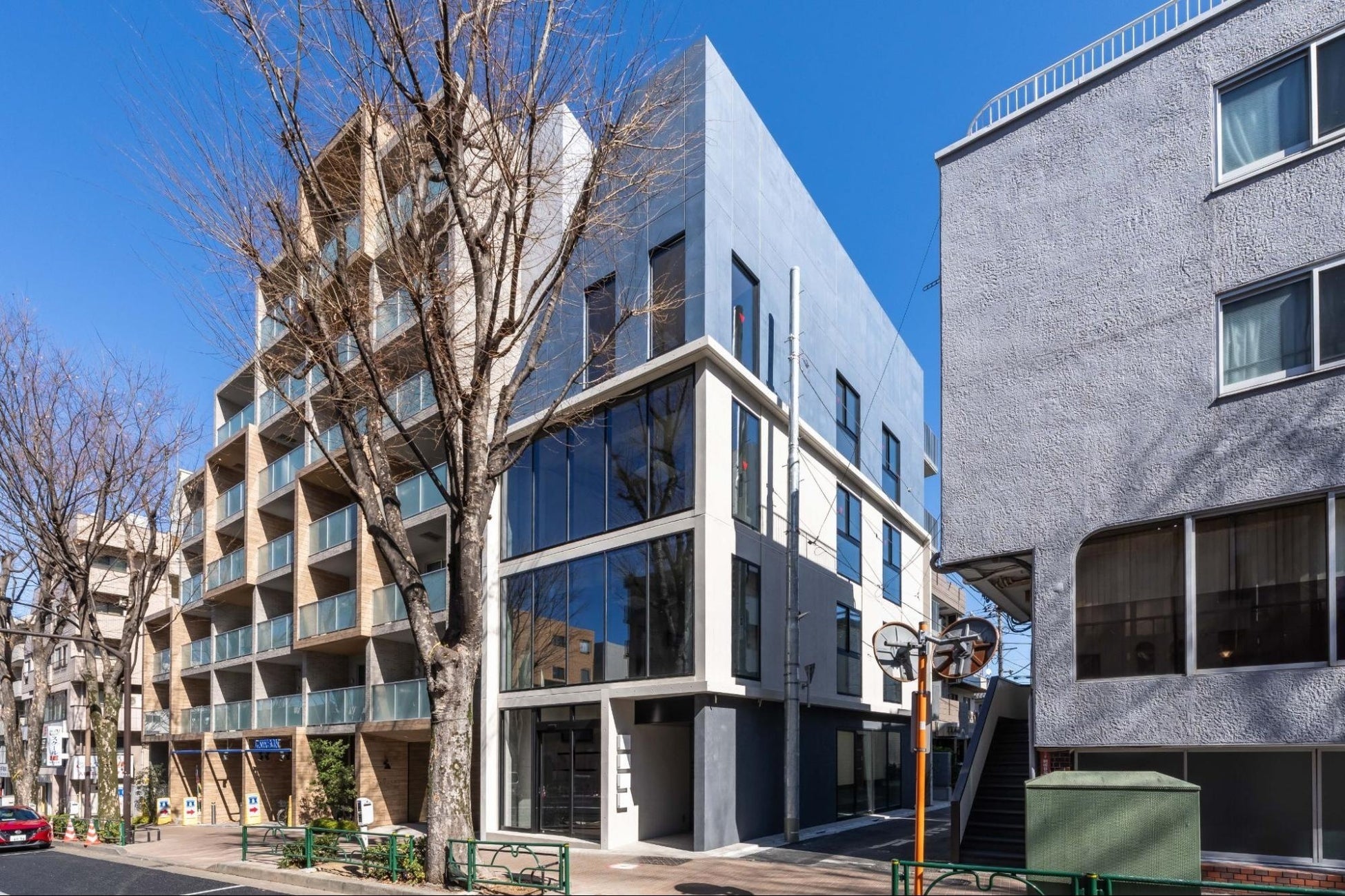 角地を活かした開放感あるデザインと、夜景に映える門型ライティングが特徴です。中杉通りに面した窓からは、ケヤキ並木を借景として楽しめます。
