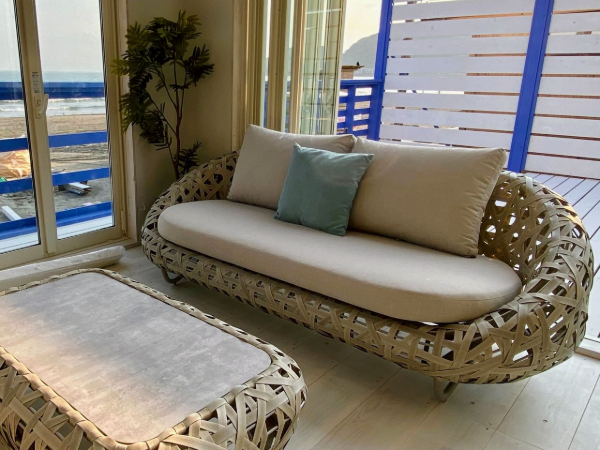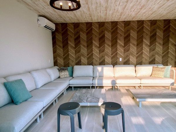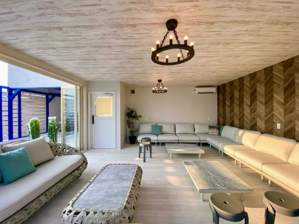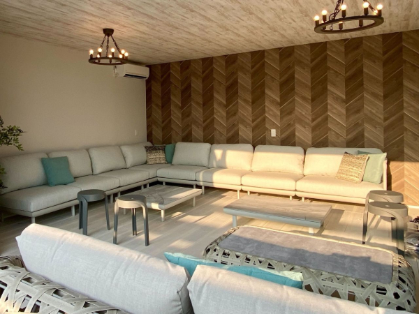 「avex beach paradise」では、高級海外リゾートをテーマに、印象的な大型L字ソファが中心に据えられ、ゆったりと贅沢な空間演出がされています。