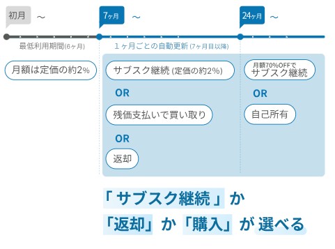 最初から所有する購入や返却前提のレンタルと違い、最低利用期間以降は「返却」または残価支払いによる「購入」が選べるそうです。