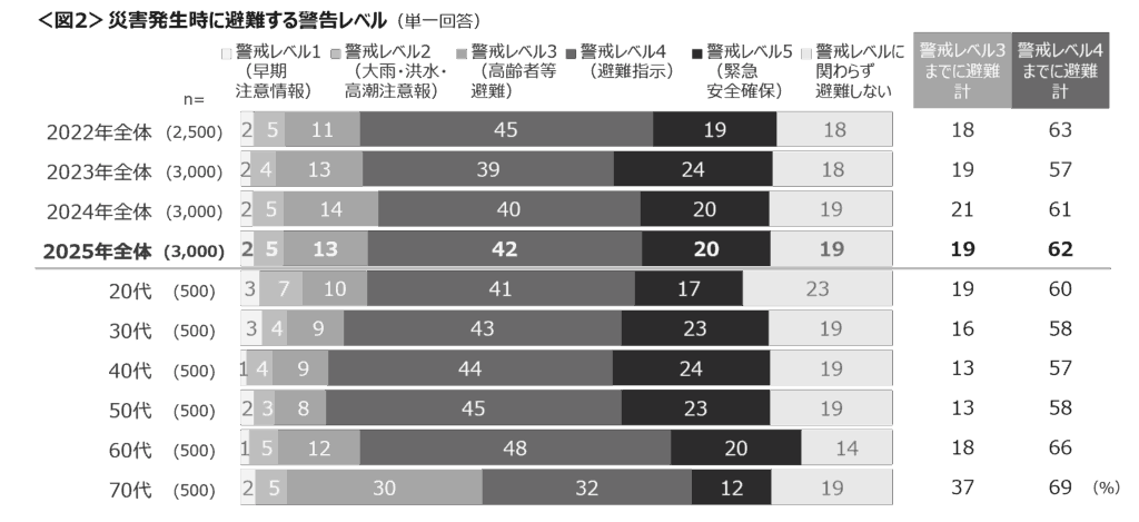 70代は「警戒レベル1(早期注意情報)」から「警戒レベル3(高齢者等避難)」までに避難する人が、37%を占める結果になったそうです。<図2>