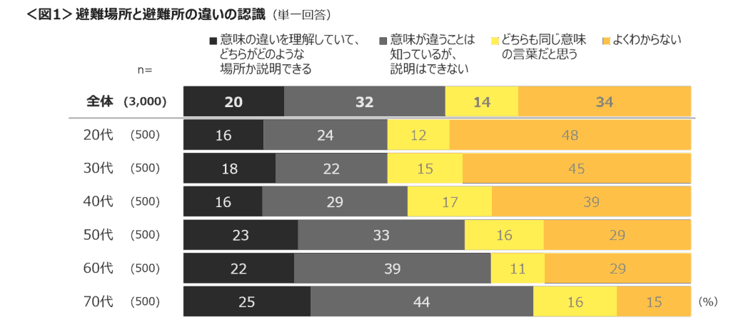 避難場所と避難所の違いを確認したところ「わからない」34%、「意味が違うことは知っているが、説明はできない」32%が多かったということです。