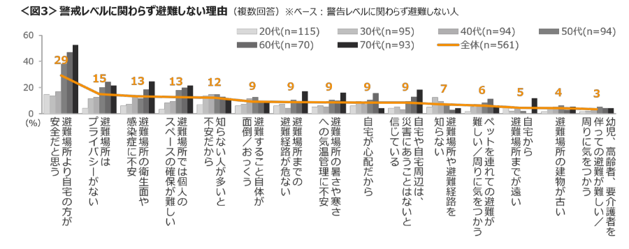 「警戒レベルに関わらず避難しない」理由は、「避難場所より自宅の方が安全」「避難場所はプライバシーがない」「避難場所の衛生面や感染症に不安」「避難場所では個人のスペースの確保が難しい」があがり、いずれも60~70代は高いという結果になったそうです。<図3>