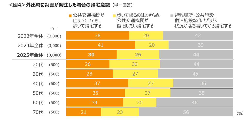 外出時に災害が発生した際の帰宅意識は「避難場所などにとどまり、状況が落ち着いてから帰宅する」44%、「公共機関が止まっていても、歩いて帰宅する」30%であり、40~60代は高めだということです。<図4>