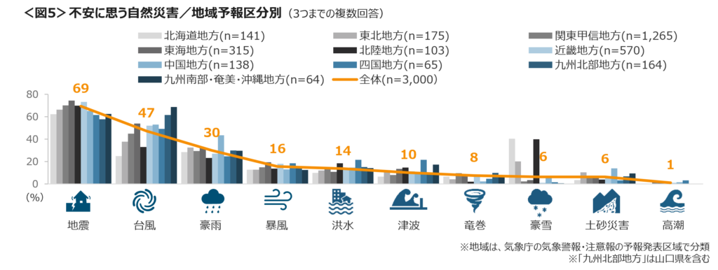 不安に思う自然災害を3つまで聴取した結果、「地震」69%、「台風」47%、「豪雨」30%がTOP3となったそうです。