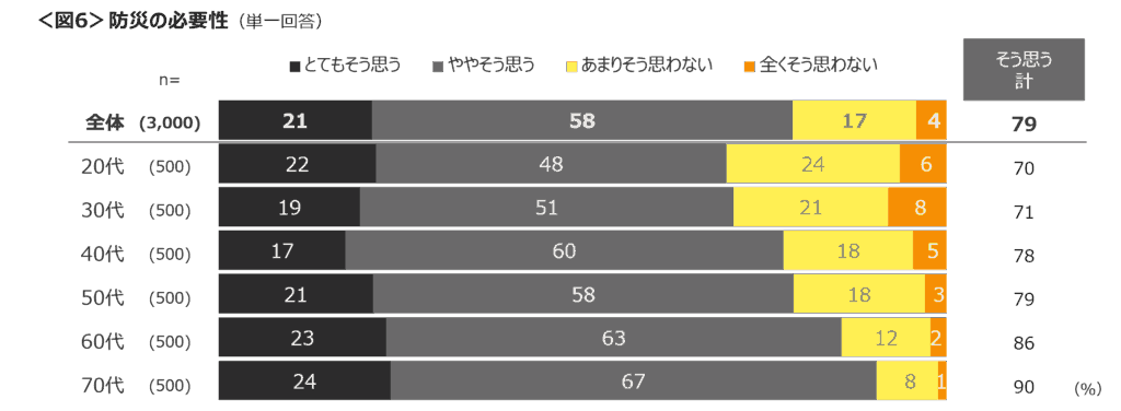 防災の必要性を感じるかについては「とてもそう思う」21%、「とても+ややそう思う」は79%となったそうです。必要性を感じている人は年代が上がるほど高まり、70代は90%に達するということです。<図6>