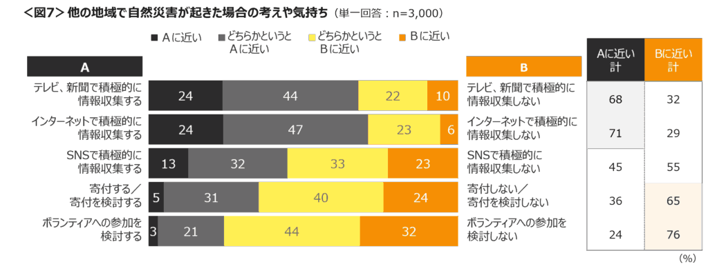 一方、「ボランティアへの参加を検討する」「寄付をする/検討する」「SNSで積極的に情報収集する」は半数を下回るということです。
