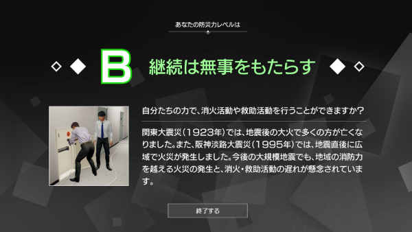 体験したストーリーで問われた各内容に対する回答結果から、プレイヤーの防災力レベルが判定され、体験が終了となるそうです。