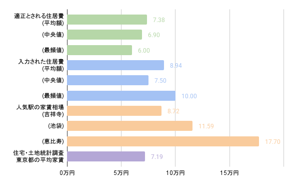 一方、入力された住居費は、平均額・中央値・最頻値ともに東京都の平均家賃を上回りました。人気駅の家賃相場との乖離も少なく、より現実的な数字となっていることがうかがえます。