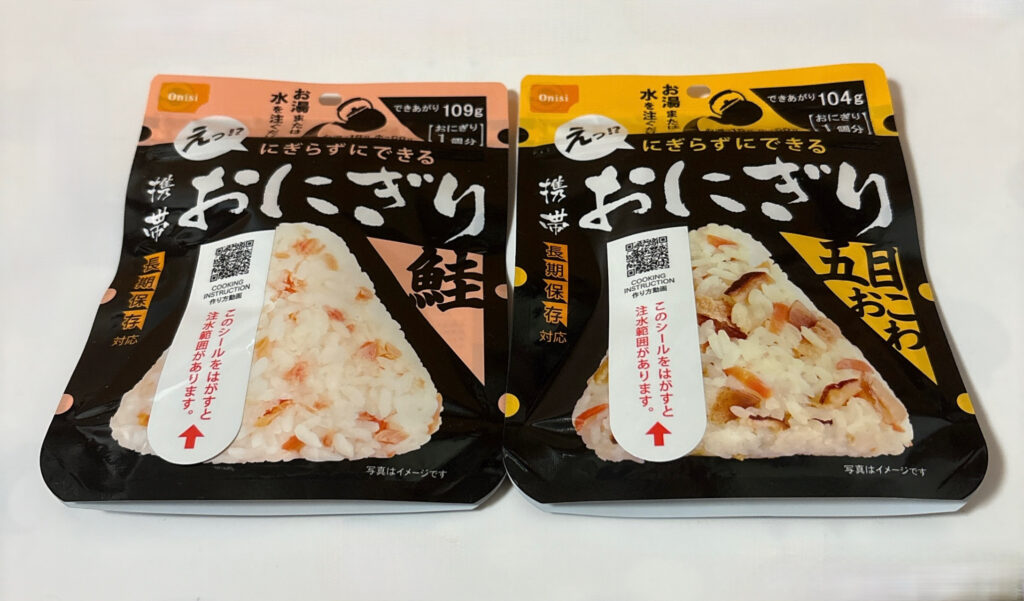 今回は、『尾西の携帯おにぎり』の五目おこわと鮭を実際に食べてレビューします。水とお湯とで作ったものも比較してみました。