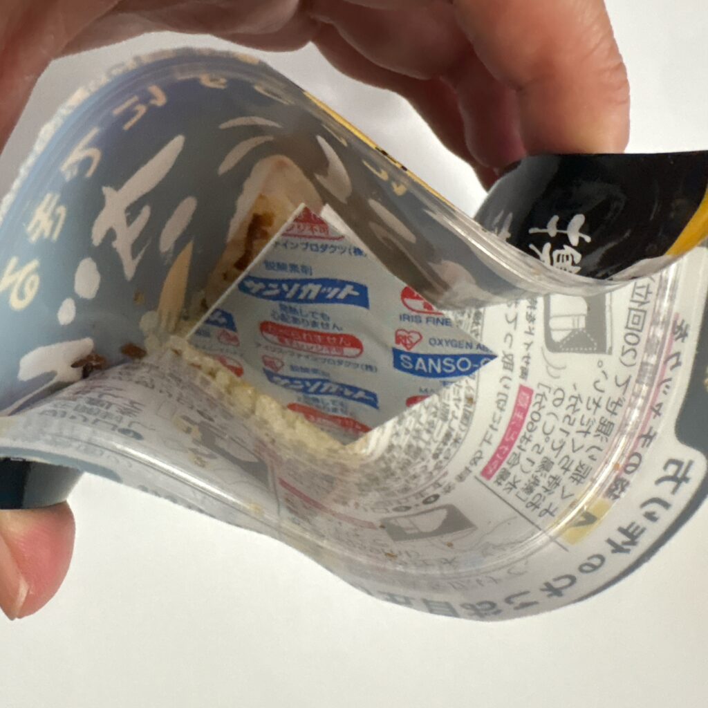 時間を置いて開封してみると、振り方が足りなかったのか、底の広げ方が悪かったのか、形がややいびつになり、具材も下に溜まっていました。