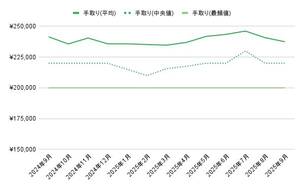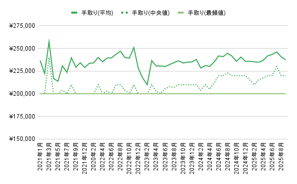 「生活費シミュレーション計算ツール」の利用状況を集計したところ、手取り月収の平均は約23.7万円、中央値は22万円でした。また、最頻値は20万円でした。
