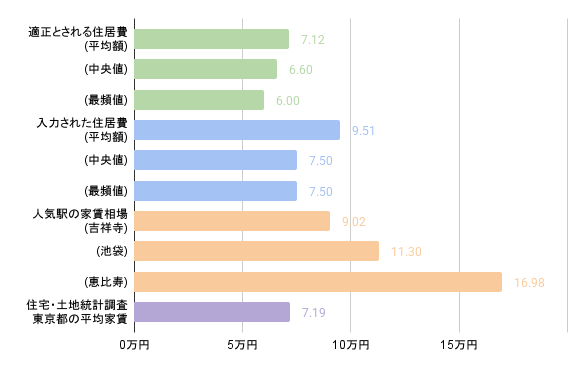 一方、入力された住居費は、平均額・中央値・最頻値ともに東京都の平均家賃を上回りました。人気駅の家賃相場との乖離も少なく、より現実的な数字となっていることがうかがえます。