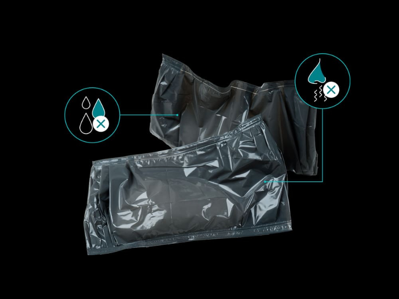 ニオイ漏れや液体漏れを防ぐクレサナ専用の高バリアフィルムで、1つ1つ丁寧に密閉処理。一般的なポータブルトイレ用フィルムより900倍ニオイ漏れが少ないことが実証されているそうです。