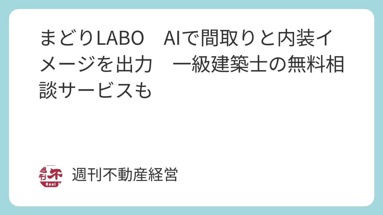 まどりLABO(東京都大田区)は15日、日本で初めて住む人がAIを活用して「間取りAI生成」と「3DイメージAI生成」ができるサービスと、一級建築士に1週間無料で相談できるサービスを同時リリースした。