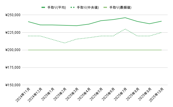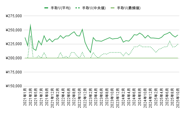 「生活費シミュレーション計算ツール」の利用状況を集計したところ、手取り月収の平均は約24.1万円、中央値は22.5万円でした。また、最頻値は20万円でした。