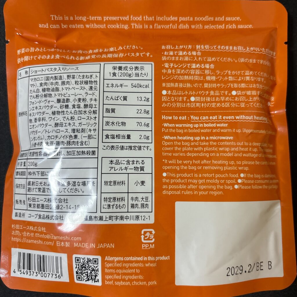 今回は、災害時を想定して「ボロネーゼ」を実食レビューします。