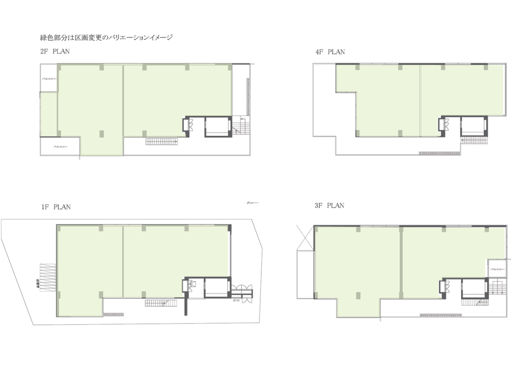 区画変更をしやすくするため、1フロア2区画のシンプルなフレームとし、界壁は非構造壁とすることで隣接区画の一体利用も想定しているそうです。