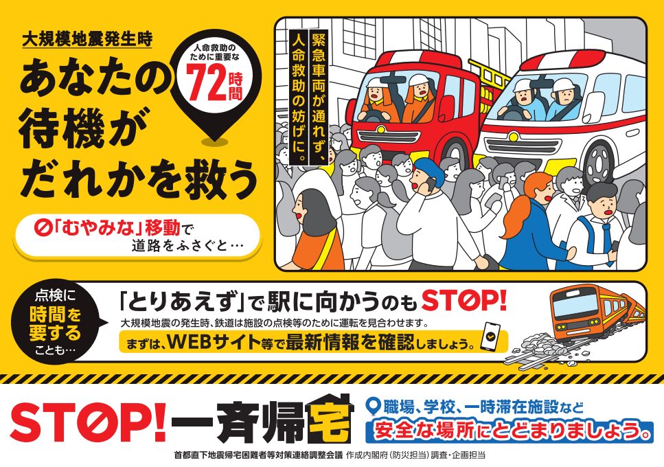 内閣府では大規模地震の発生の際、一斉帰宅をせずに待機することを推奨しています。