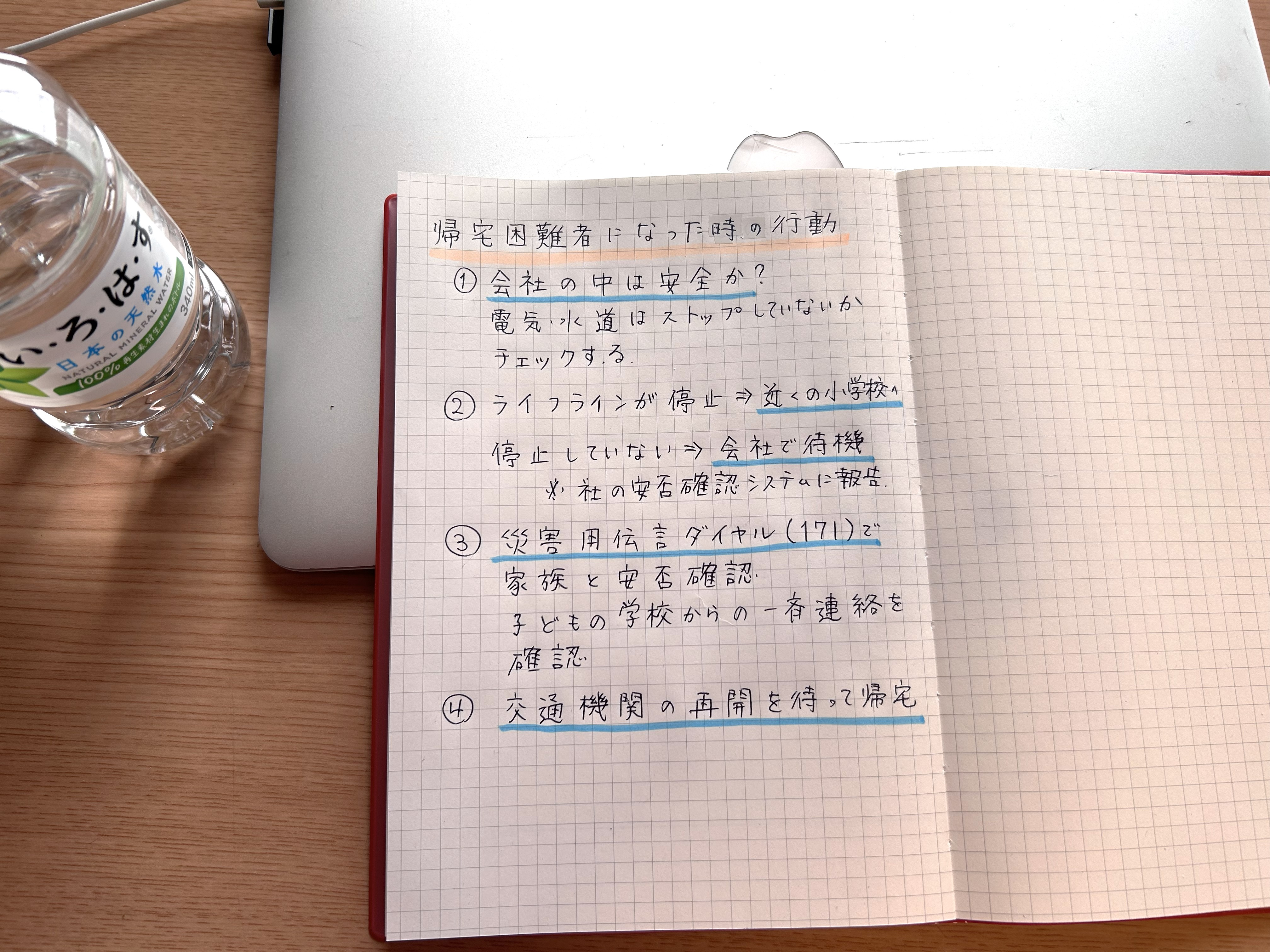 もし私が会社で被災し、帰宅困難者になってしまったときにする行動プランは以下のとおりです。