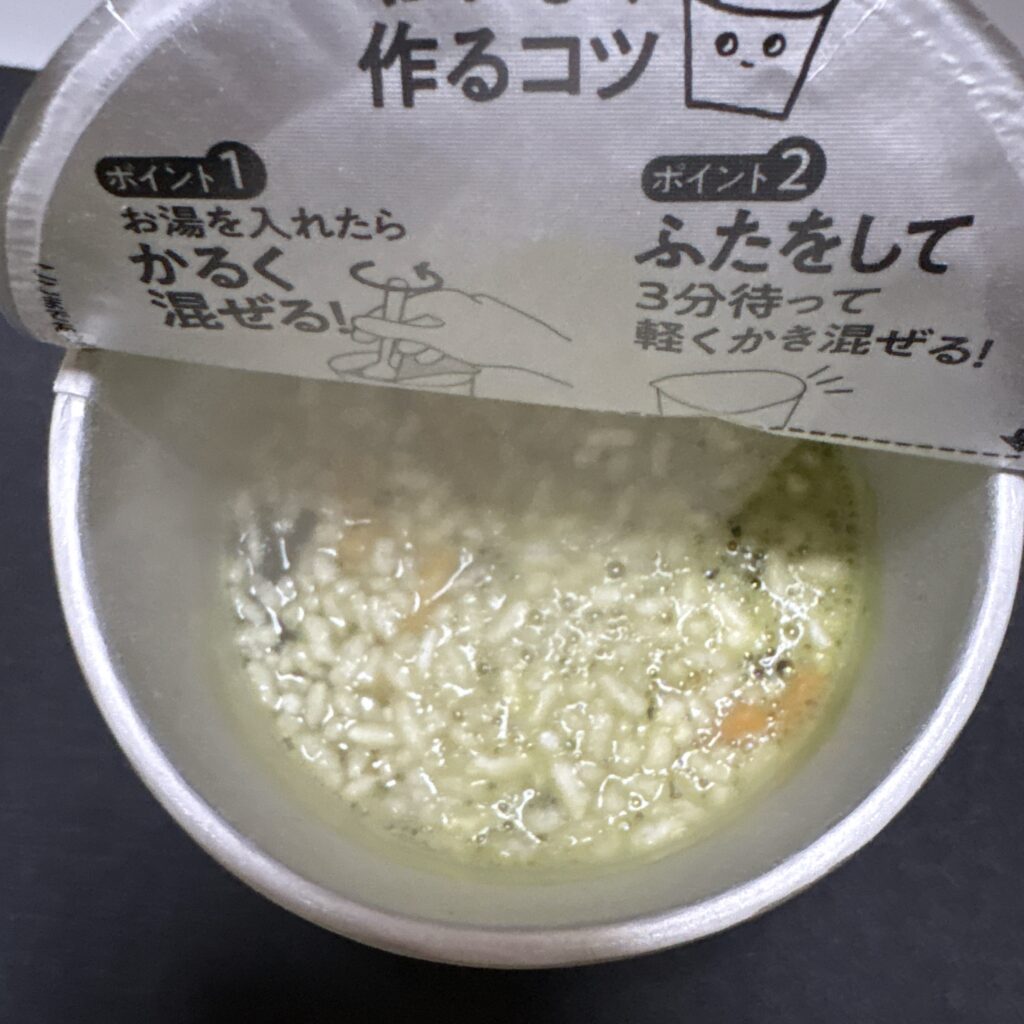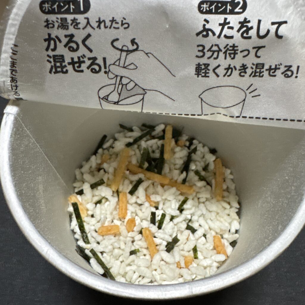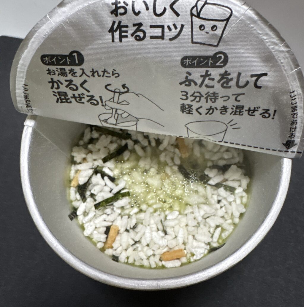 ごはんとお茶づけの素(だしと具材)がひとつのカップにまとまっていて、フタを開けてお湯を注ぐだけで食べられるのが特徴です。