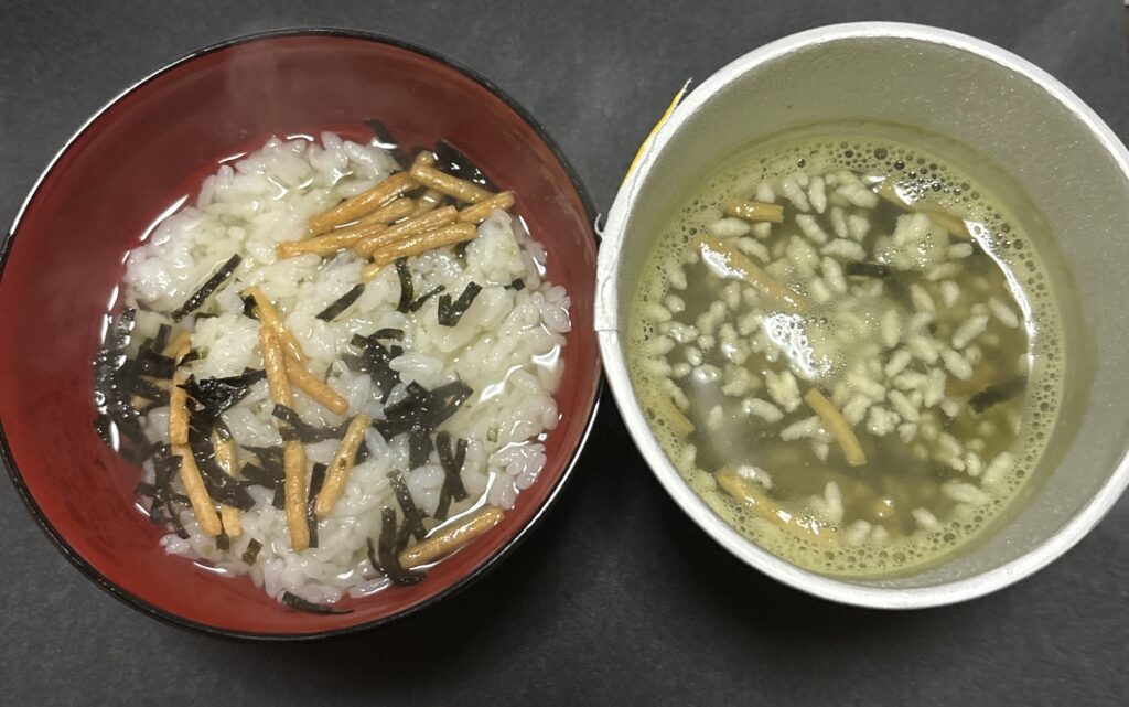 〇 普通に炊いたごはんと比べると、ややパラつきがあり、わずかに芯を感じる部分もありますが、スープの味はおなじみの「お茶づけ海苔」です。