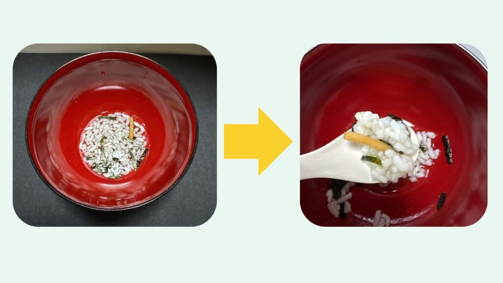 常温の水を加えて1時間ほど置いたところ、ごはんはしっかり柔らかくなり、冷やし茶づけとして食べられる状態になりました。