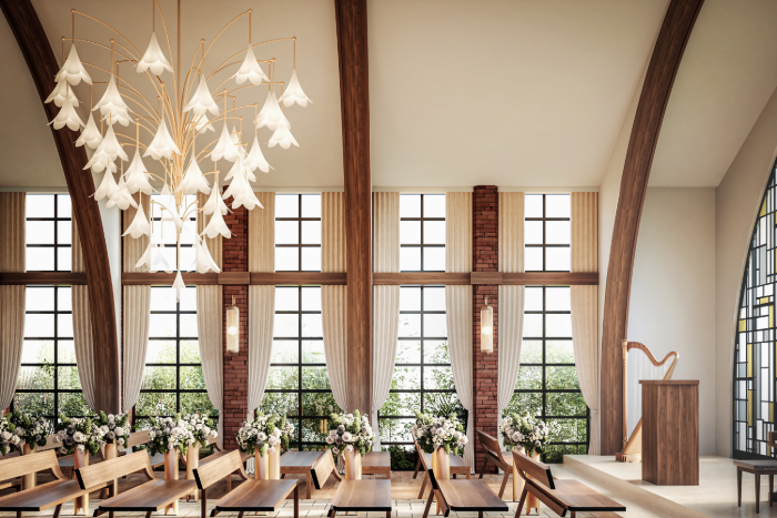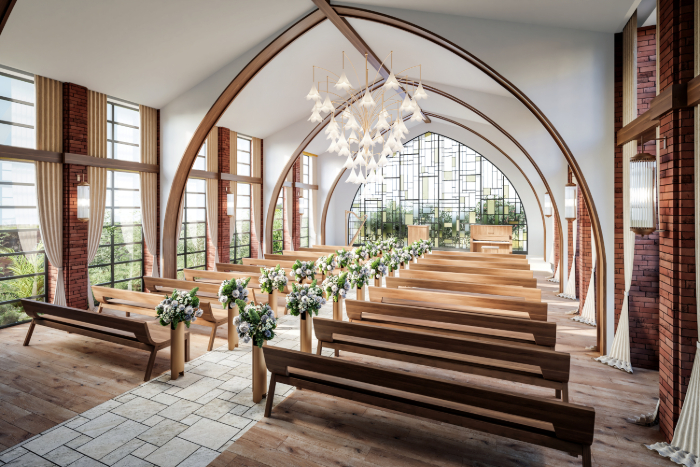 天井から自然光がたっぷりと降り注ぎ、窓からは緑が望めるチャペルが用意されています。木の温もりと正面のステンドグラスの輝きが、ふたりの誓いをやさしく包み込むということです。