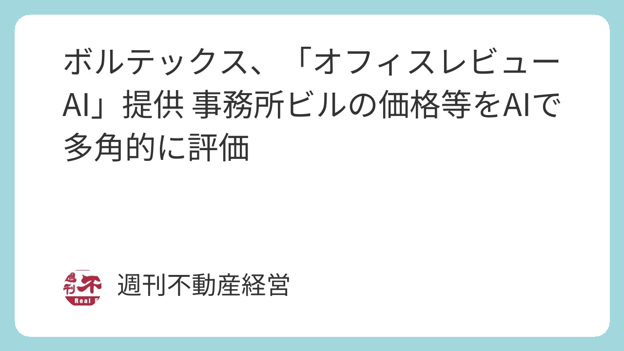 ボルテックス(東京都千代田区)はAIを活用したオフィス価格査定・レビューサービス「OFFICE REVIEW AI(オフィスレビューAI)」をオーナー向けマイページ内で今月中旬に提供する。
