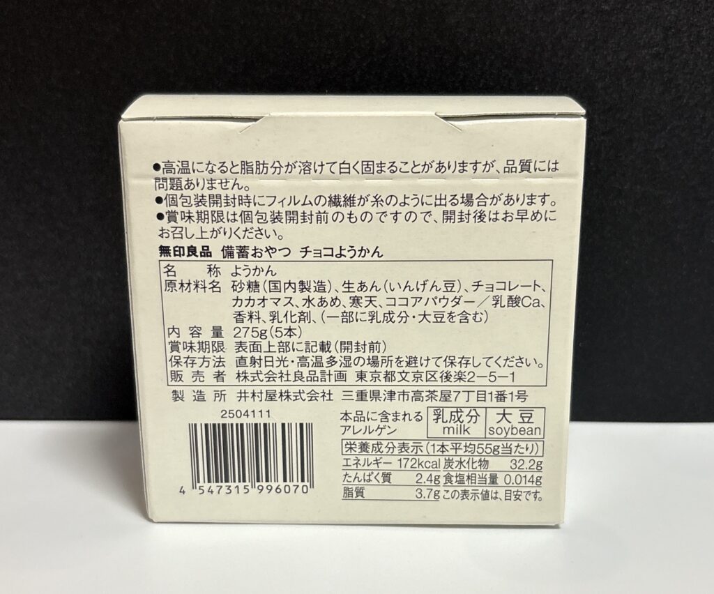総合すると、無印のチョコようかんは、非常時に備える甘いものとして取り入れやすい一品だと感じました。