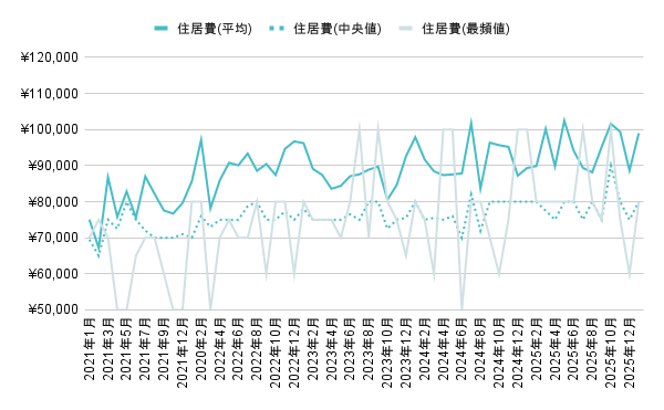 「ずっと賃貸・マンション購入 比較シミュレーション計算ツール」にて入力された現在の住居費(家賃・管理費・共益費などの合計)は、平均金額で約9.9万円、中央値は8万円でした。また、最頻値は8万円でした。